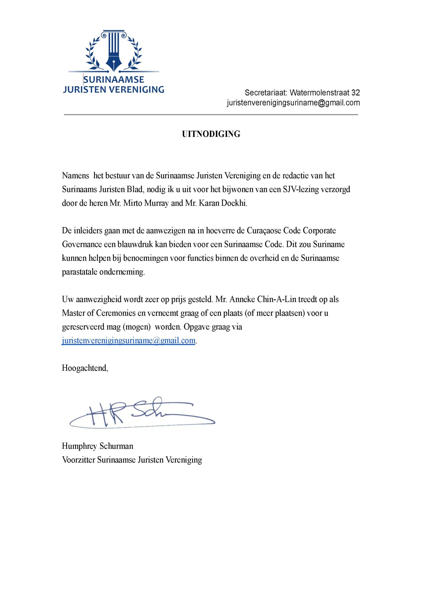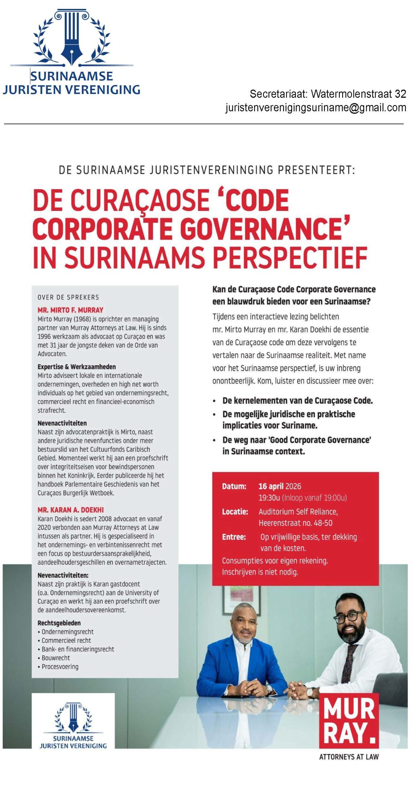 De Surinaamse Juristen Vereniging (SJV) en de redactie van het Surinaaams Juristen Blad organiseren een SJV-lezing : de Curaçaose ‘Code Corporate Governance’ in surinaams perspectief.