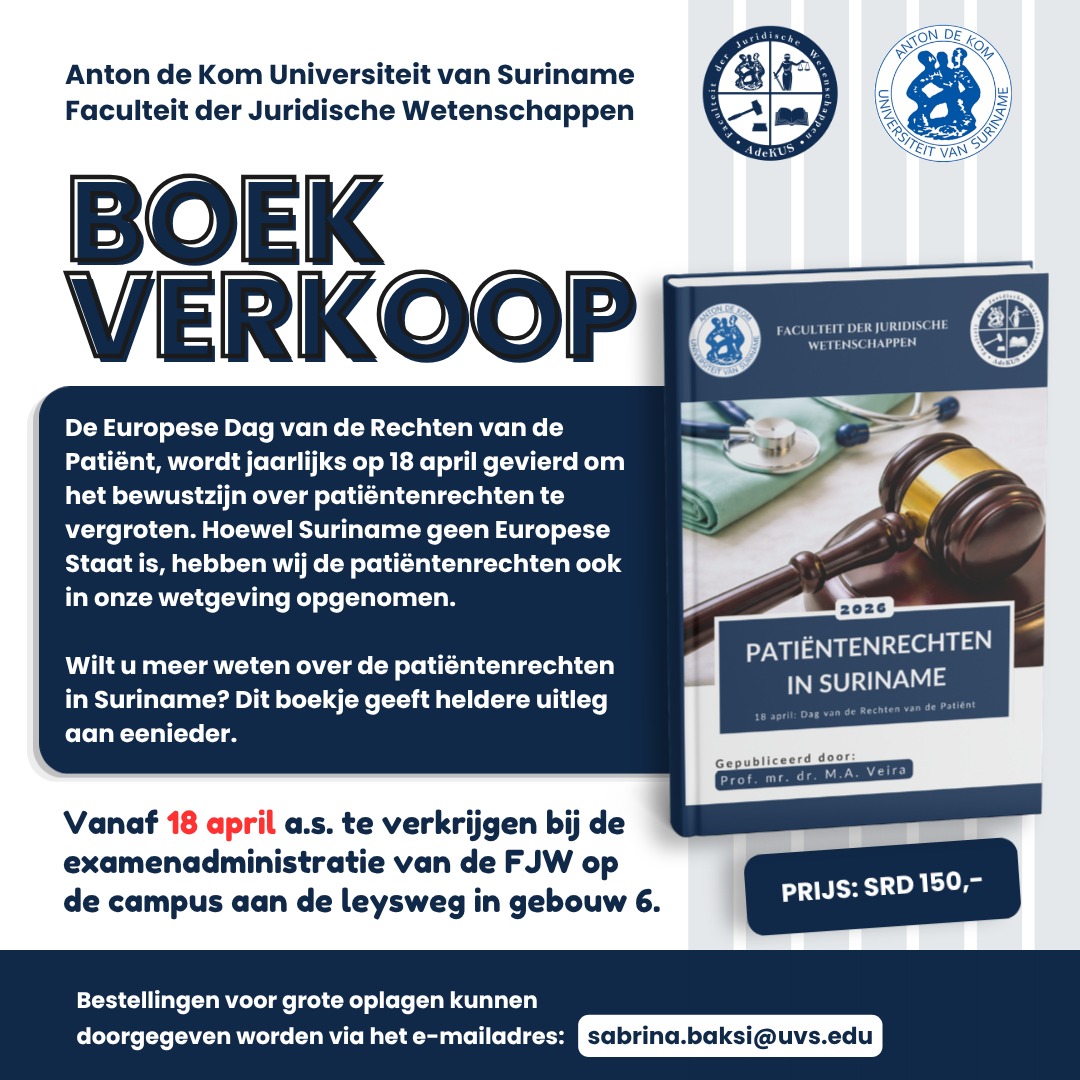 Ter gelegenheid van de Europese Dag van de Rechten van de Patiënt (18 april) biedt de Faculteit der Juridische Wetenschappen van de Anton de Kom Universiteit van Suriname het boek “Patiëntenrechten in Suriname” ten verkoop aan.